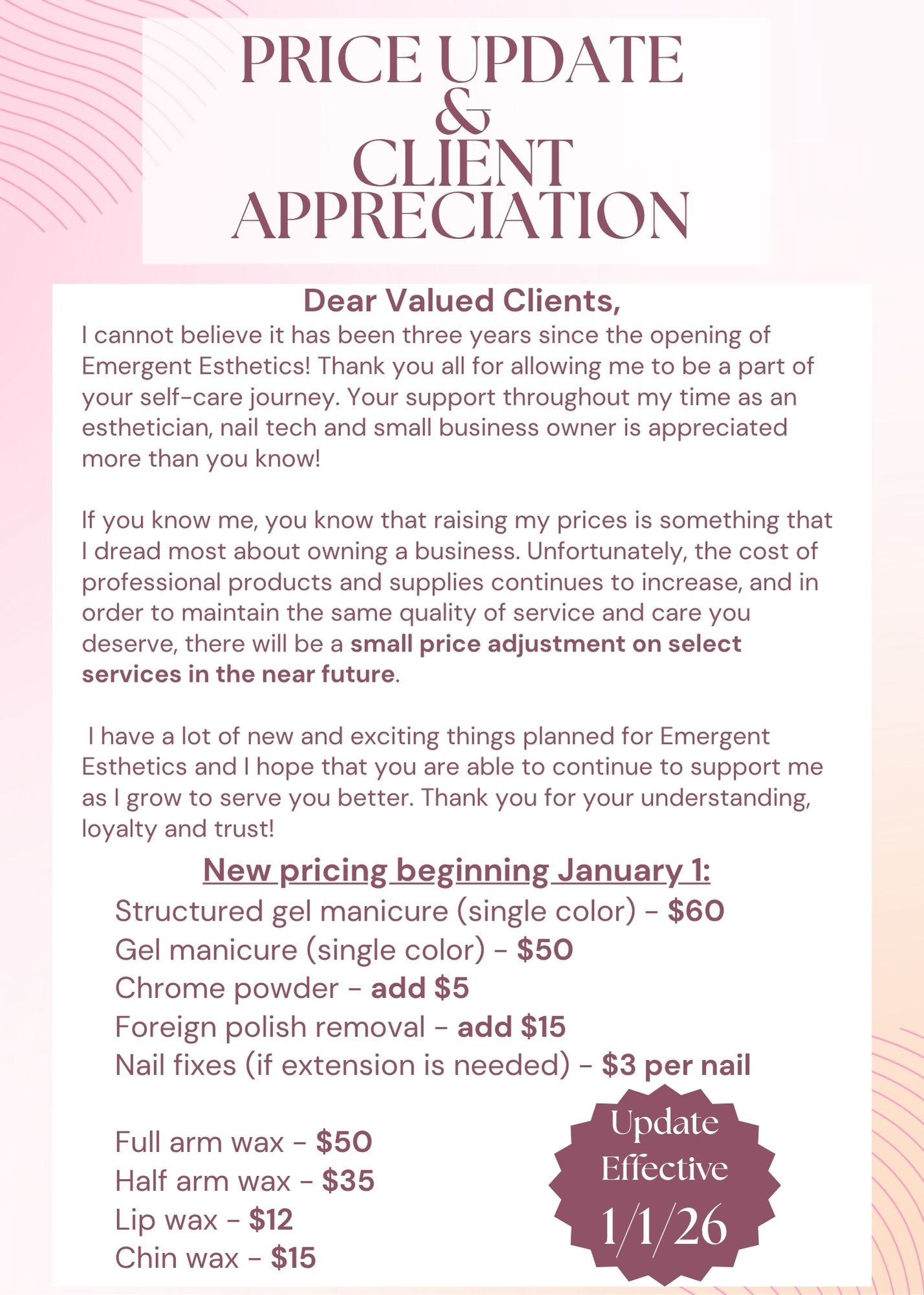 It is recommended that client's do not shave for 10-14 days prior to having this service performed.